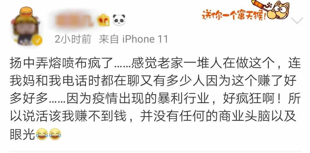一個揚中的網(wǎng)友在微博上說:揚中弄熔噴布瘋了.....感覺老家一堆人在做這個,連我媽和我電話時都在聊又有多少人因為這個賺了好多好多......