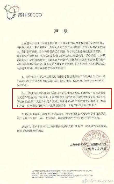 對于S2040聚丙稀能否應(yīng)用到熔噴布生產(chǎn),上海賽科也出了一份聲明,聲明上寫到:上海賽科從未向任何市場和用戶明示或默認(rèn)S2040聚丙稀產(chǎn)品可以用于無紡布領(lǐng)域的加工和應(yīng)用。上海賽科對于該產(chǎn)品用于這些特殊或個別用途不提供任何保證。